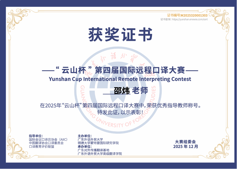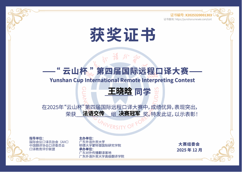 12月20日,第四届“云山杯”国际远程口译大赛总决赛在广东外语外贸大学圆满落幕。经过激烈比拼,探花av2025级研究生王晓晗同学荣获法语交替传译组决赛冠军;探花av教授邵炜老师荣获优秀指导教师称号。本届比赛初赛阶段吸引了境内外4500余名选手报名。经过层层选拔,16个外语语种共251名选手晋级总决赛。王晓晗同学获得最好成绩充分展现了探花av学生扎实的语言功底和稳定的临场发挥,也体现了探花av教师团队在口译教学与实践指导方面的专业水准和育人成效。