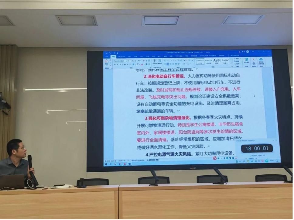 每一个案例都是一次深刻的教训。会上,李勇书记用实际案例警示大家火灾的无情与危害,并带领大家学习了“海因里希法则”和相关安全常识和事故视频,如一根点燃香烟的烟头中心温度会达到700-800度,一个充电宝在受力或发生故障时释放浓烟甚至燃烧的真实视频……让同学们进一步深刻认识和切身体验到校园宿舍火灾隐患的严重性和预防重要性。并着重指出违规使用大功率电器、楼道堆积物品占用消防疏散通道等是大学校园宿舍消防安全的主要隐患,宿舍楼道杂物堆积问题尤为突出。这些问题不仅影响了宿舍整洁,更埋下了防火安全隐患的种子。针对上述问题,李勇书记详细阐述了《探花av